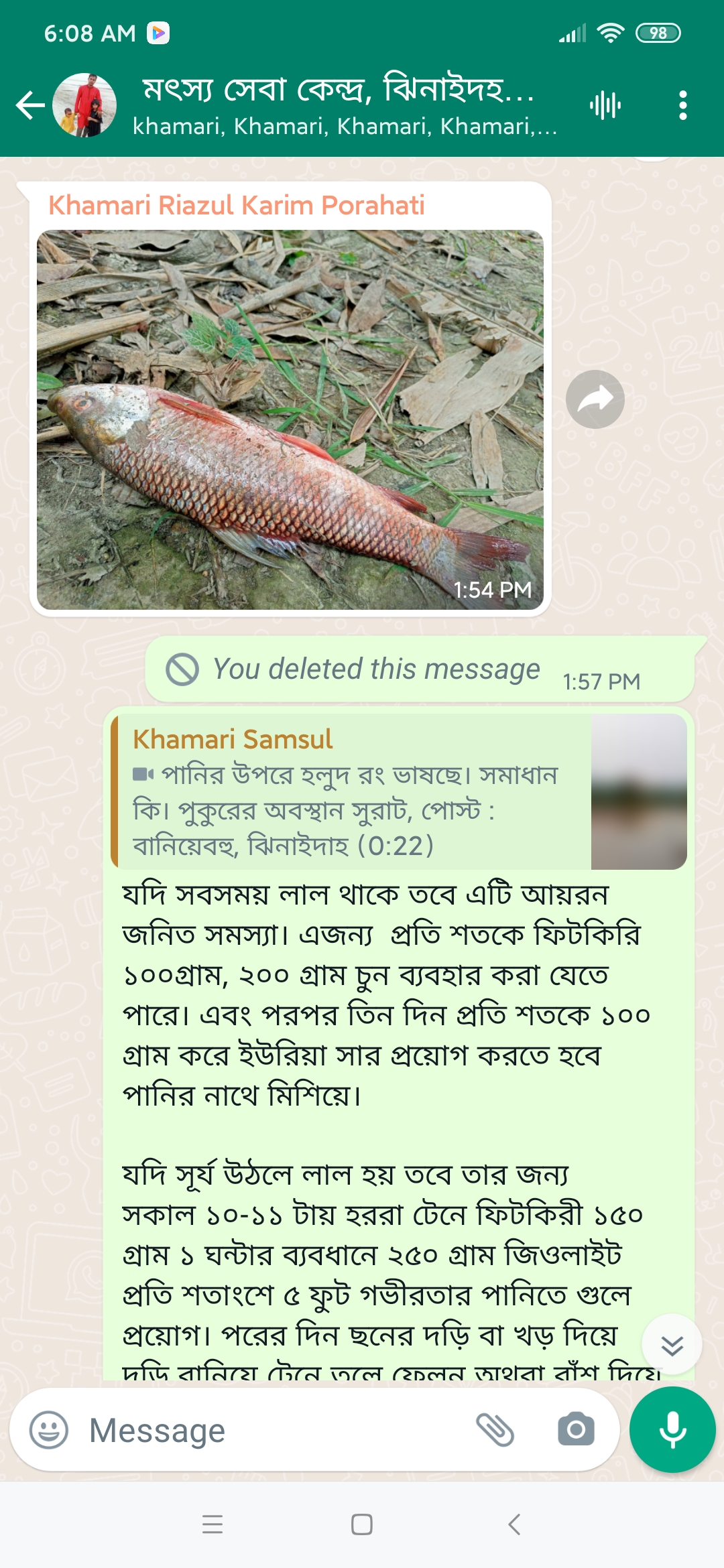 | ০১ | ঝিনাইদহ সদর উপজেলার মৎস্য খামারীদের সংযুক্ত করে “মৎস্য পরামর্শ কেন্দ্র ঝিনাইদহ সদর নামে WhatsApps গ্রুপের মাধ্যমে পরামর্শ প্রদান করা হচ্ছে | |